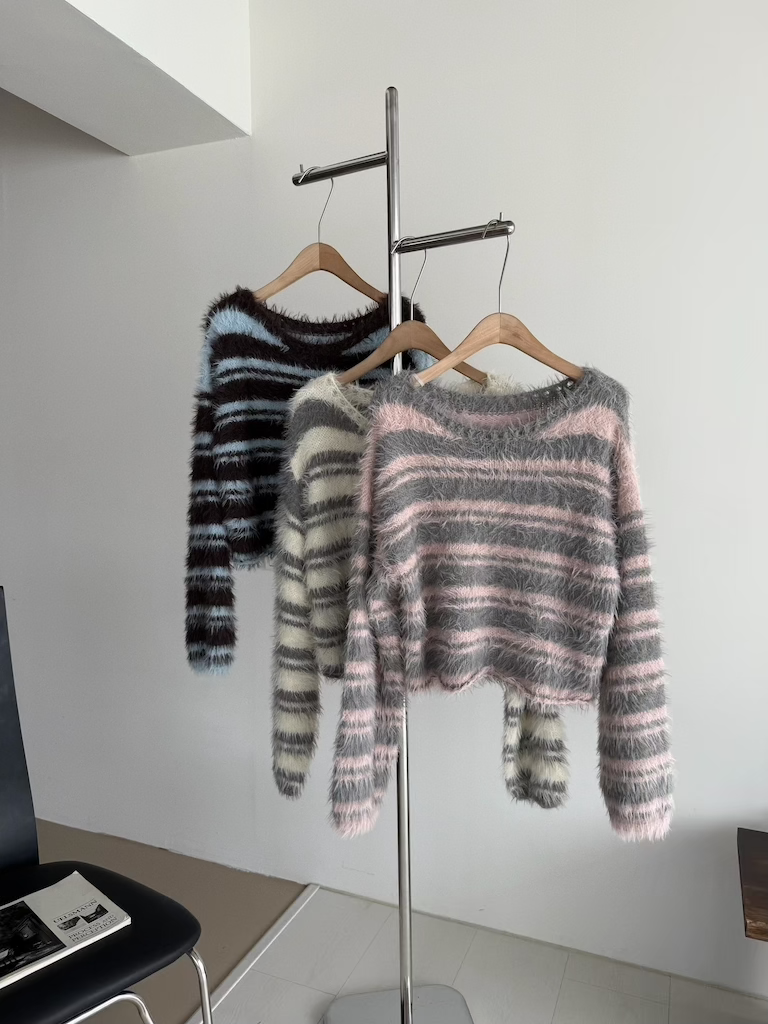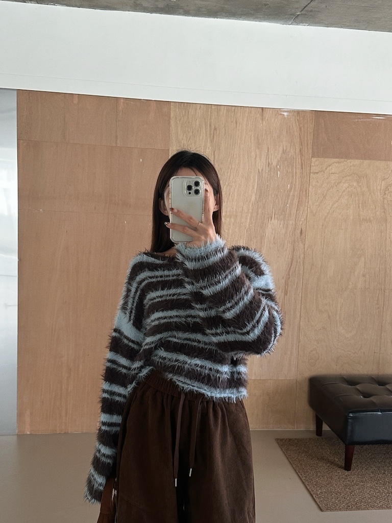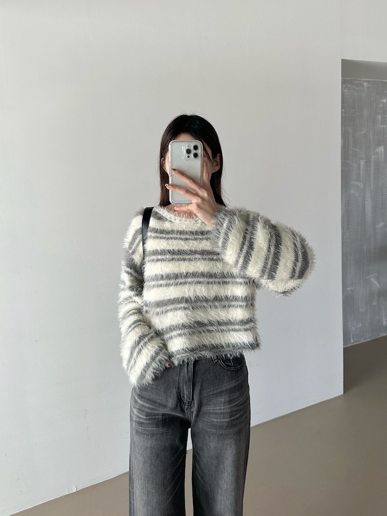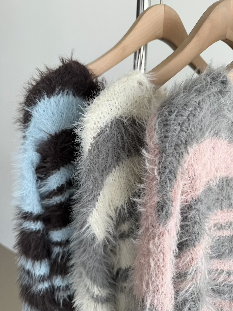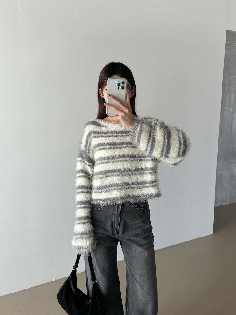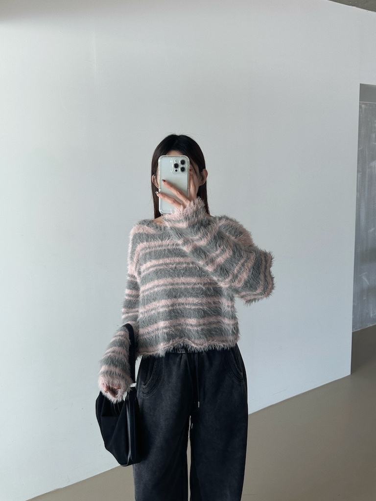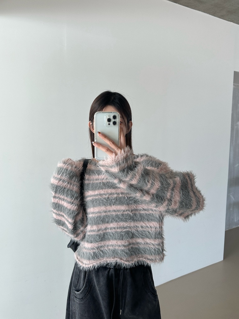 軟軟長毛條紋微短版毛衣